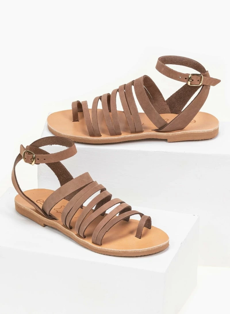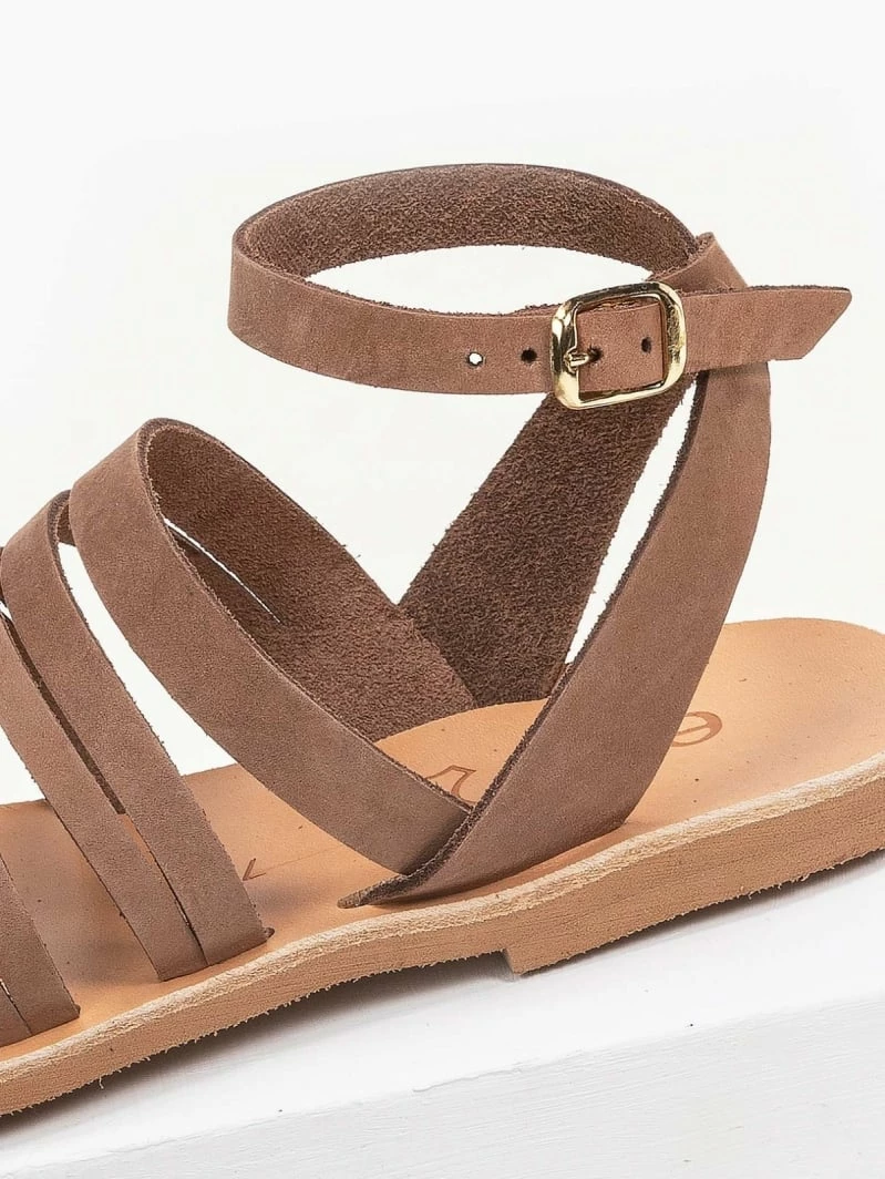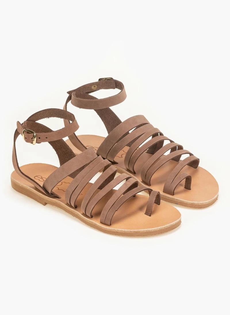 Estil δερμάτινα ίσια πέδιλα με λεπτά λουράκια. Δένουν στο ύψος του αστραγάλου. Ελληνικής κατασκευής, χειροποίητα.