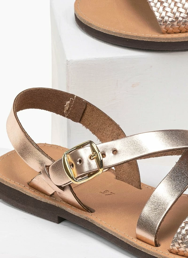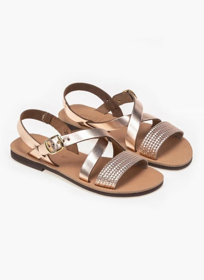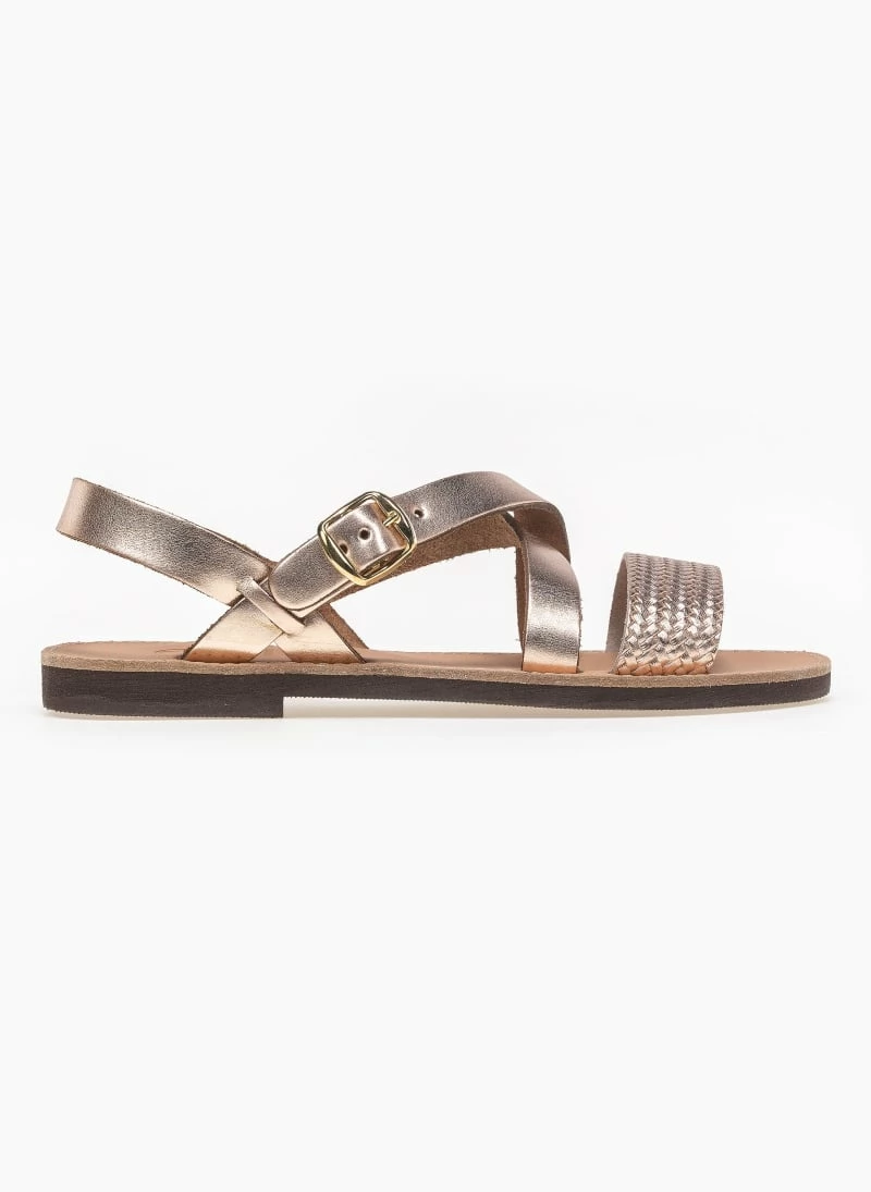 Estil δερμάτινα ίσια πέδιλα με χιαστί λουράκια στο κουτεπιέ. Έχουν ανάγλυφο pattern ψάθα στη φάσα. Ελληνικής κατασκευής, χειροποίητα.
