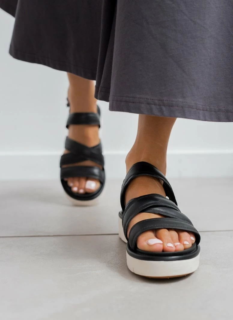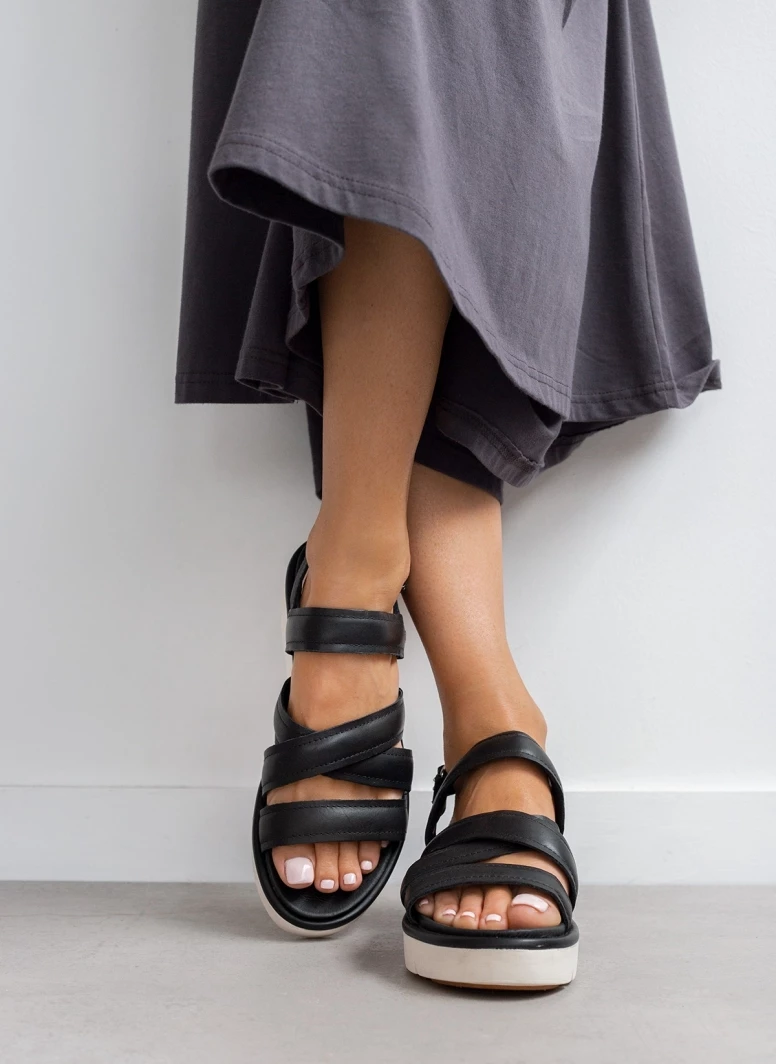 Flatform δερμάτινα πέδιλα με φαρδιά λουράκια.Έχουν μικρό μεταλλικό στοιχείο στην εξωτερική τους πλευρά.Δένουν στο πλάι.