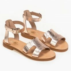 Estil φλατ δερμάτινα πέδιλα με ανοίγματα στη φάσα. Δένουν με μπαρέτα στο ύψος του αστραγάλου. Ελληνικής κατασκευής, χειροποίητα.