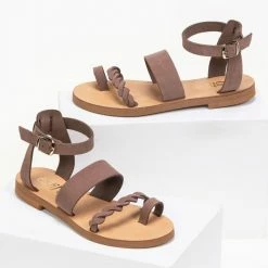 Estil nubuck δερμάτινα ίσια πέδιλα. Έχουν πλεγμένο λουράκι στο κουτεπιέ και δένουν με μπαρέτα στο ύψος του αστραγάλου. Ελληνικής κατασκευής, χειροποίητα.