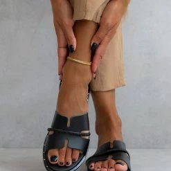 Σανδάλια δερμάτινα ESTIL με ανοίγματα και Strass – Μαύρο