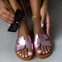 Σανδάλια δερμάτινα ESTIL σε μεταλλικά χρώματα – Ροζ