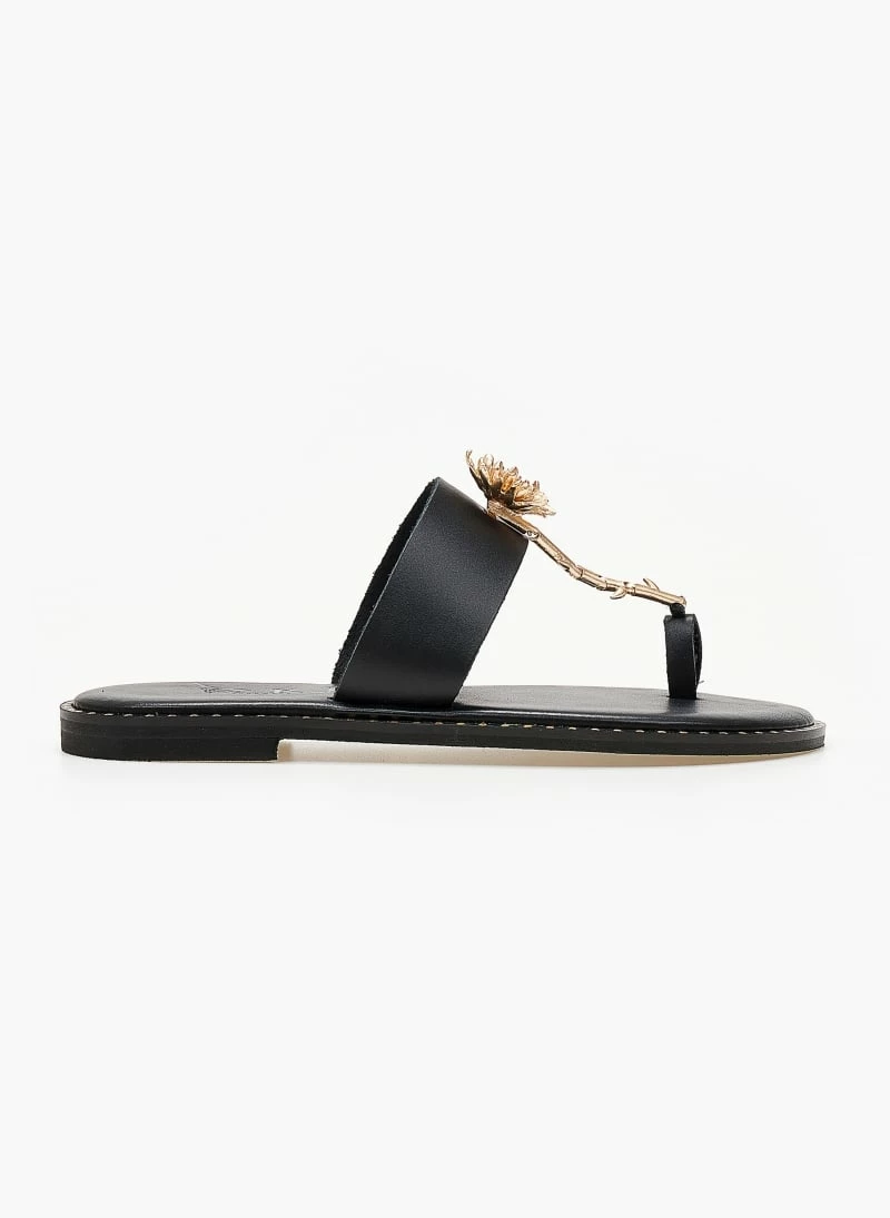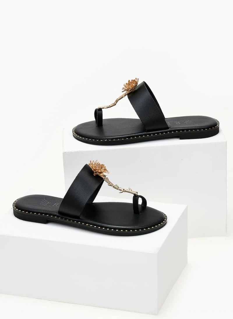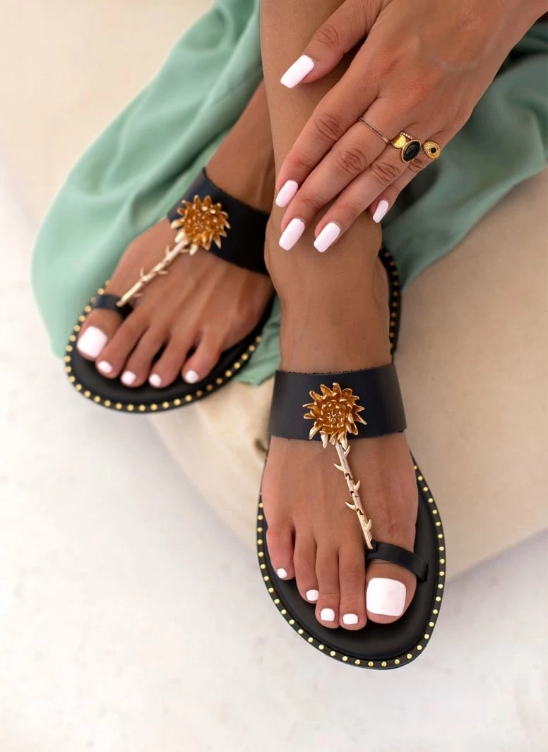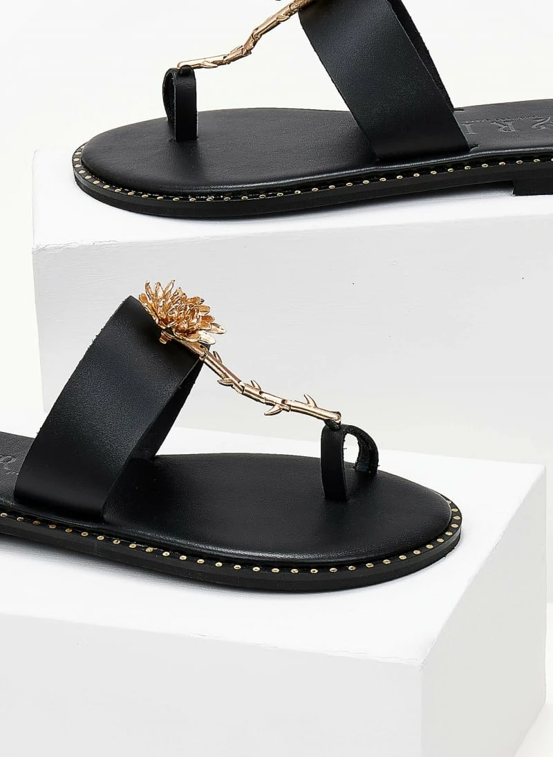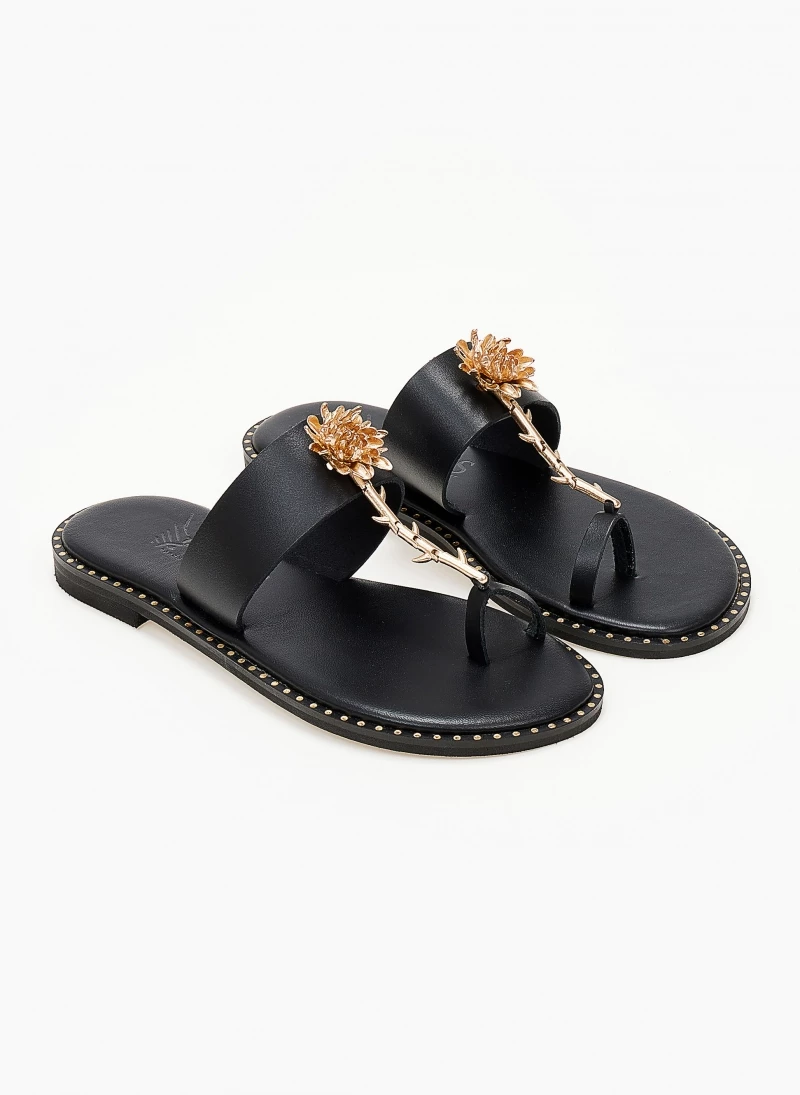 Σανδάλια δερμάτινα IRIS με λουλούδι – Μαύρο