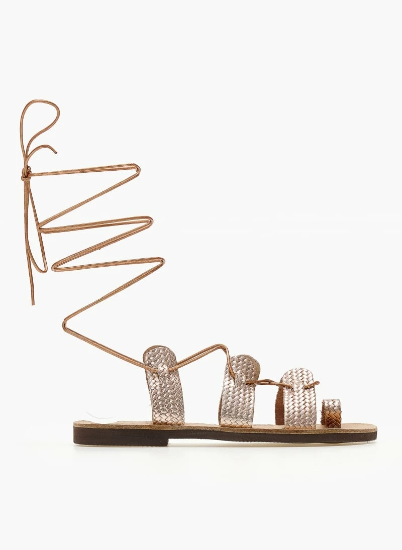 Σανδάλια ESTIL δερμάτινα με pattern ψάθα. Δένουν με κορδόνια στο ύψος της γάμπας. Ελληνικής κατασκευής.