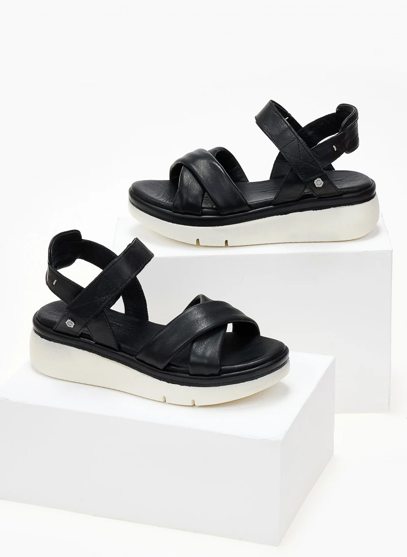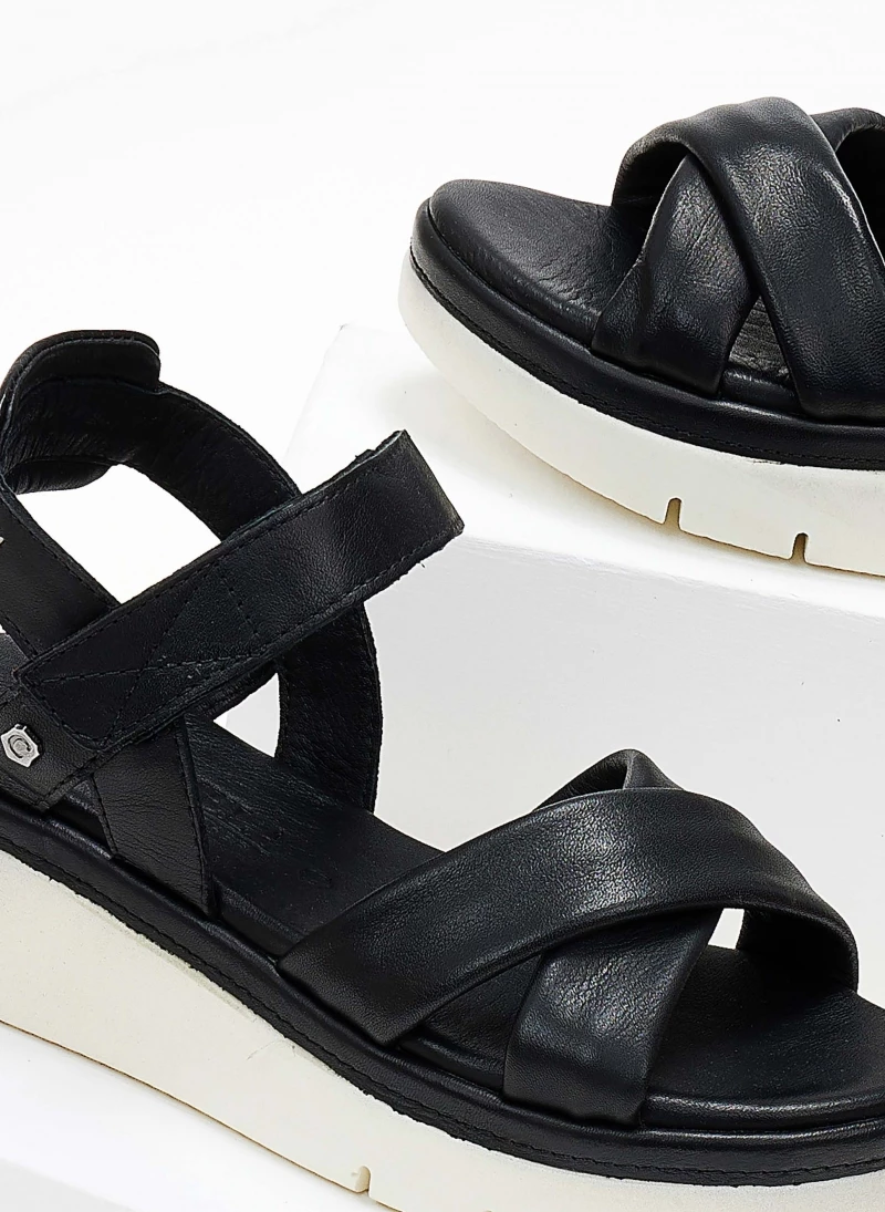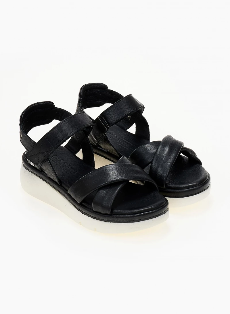 Σανδάλια δερμάτινα CARMELA με αθλητική σόλα. Έχουν σχέδιο χιαστί στο επάνω μέρος. Κλείνουν με velcro αυτικόλλητο στο ύψος του κουτεπιέ. Δερμάτινος πάτος με ενίσχυση.