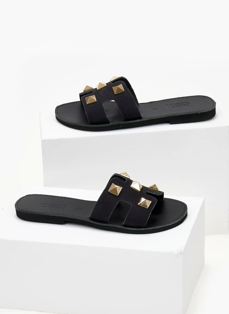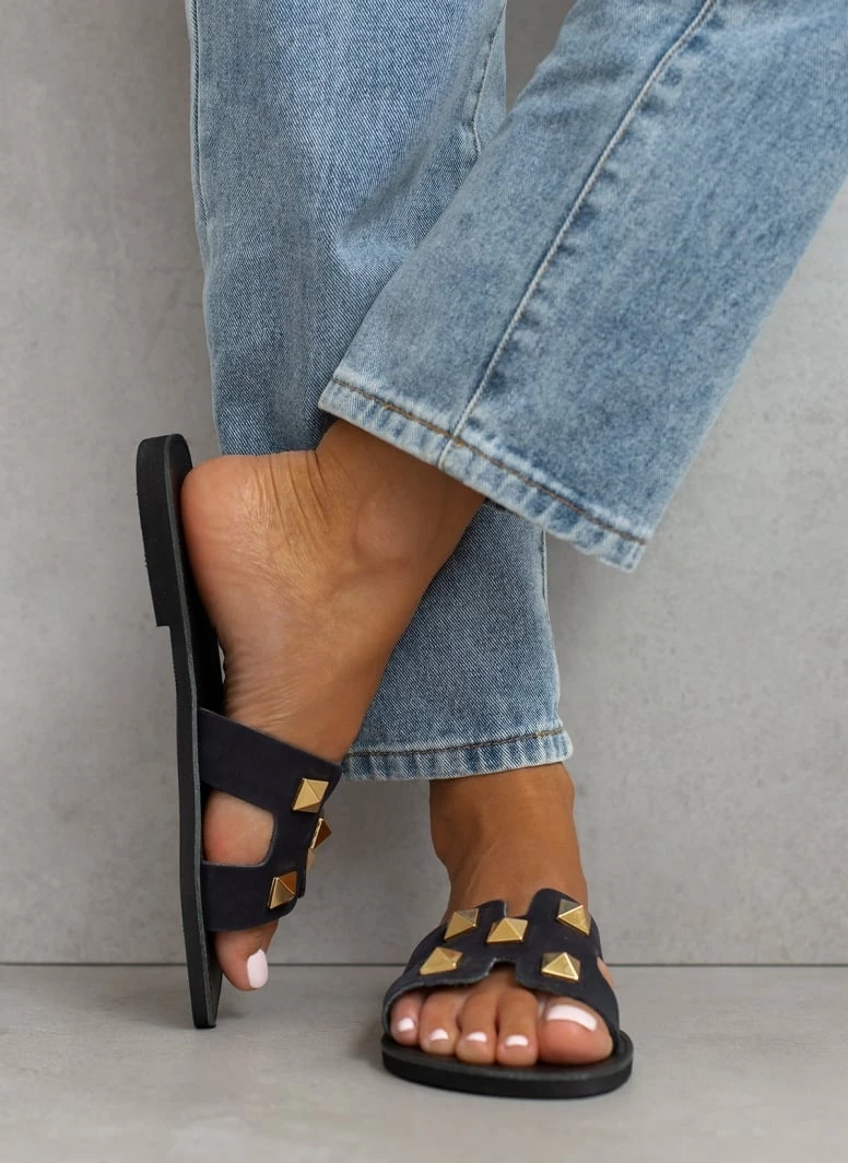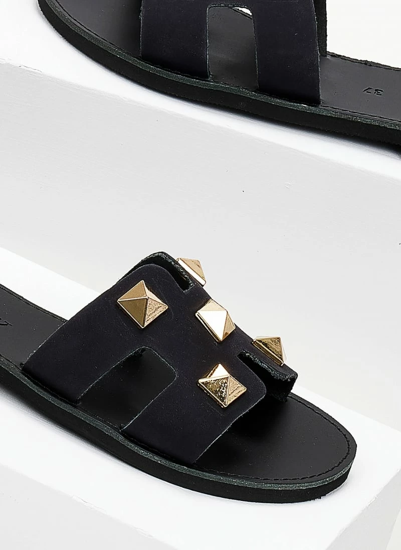 Σανδάλια από nubuck δέρμα με ανοίγματα στο πλάι. Έχουν μεταλλικά τρουκς. Ελληνικής κατασκευής,χειροποίητα.