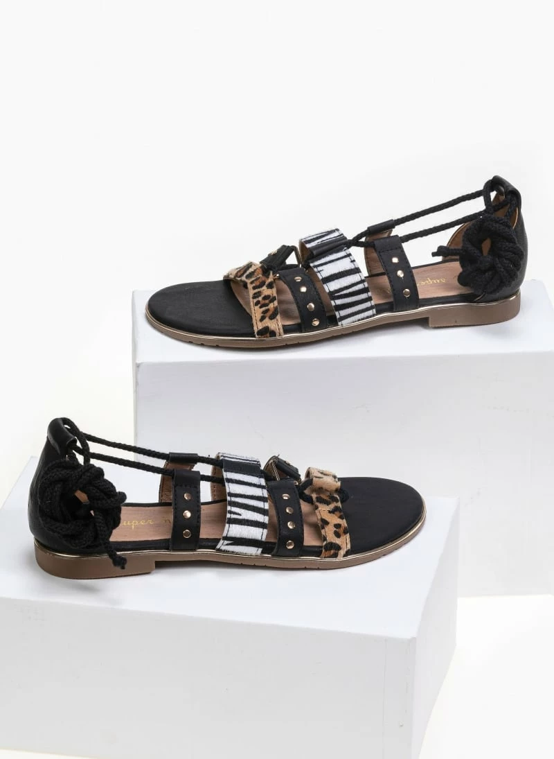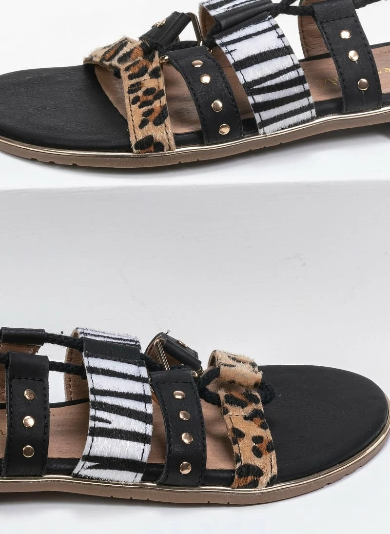 Ίσια πέδιλα με animal print λουράκια. Έχουν μεταλλική λεπτομέρεια περιμετρικά της σόλας. Η φτέρνα είναι κλειστή και δένουν με κορδόνια. Η σόλα είναι από λάστιχο.