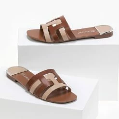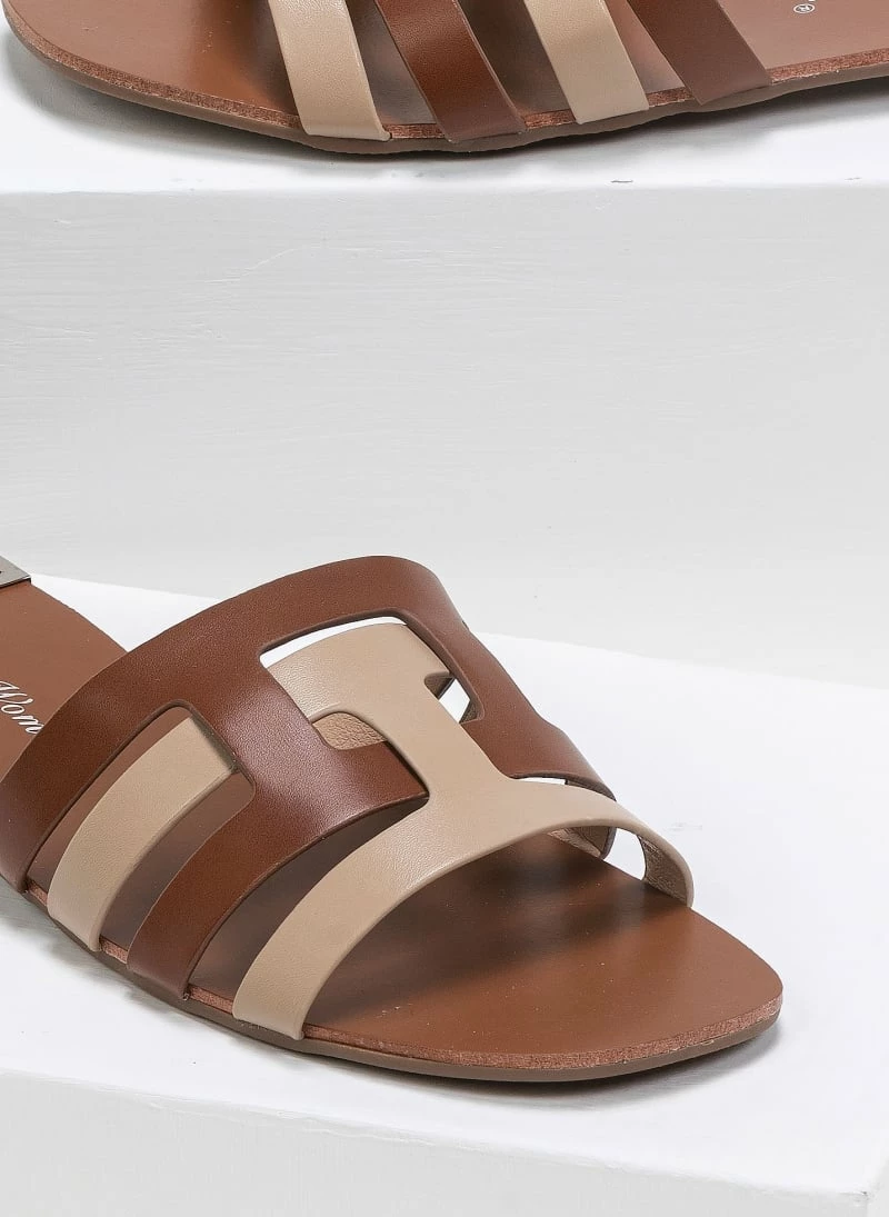 Φλατ σανδάλια σε συνδυασμούς χρωμάτων. Έχουν μέταλλο στη φτέρνα. Καρέ γραμμή.