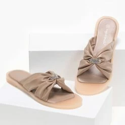 Σανδάλια φλατ με μαλακές τσαλακωτές φάσες και strass διακοσμητικό. Η σόλα είναι μαλακή από λάστιχο.