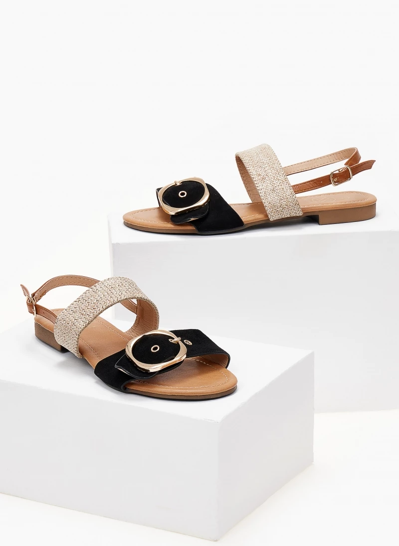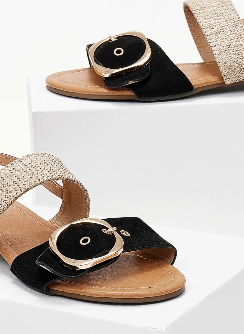 Πέδιλα σανδάλια με ψάθινη λεπτομέρεια. Έχουν suede φαρδιά φάσα με μεγάλη μεταλλική αγκράφα. Δένουν στο πλάι με λουράκι.