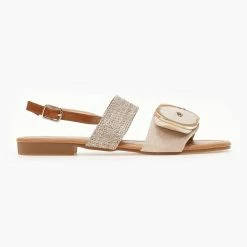Πέδιλα σανδάλια με ψάθινη λεπτομέρεια. Έχουν suede φαρδιά φάσα με μεγάλη μεταλλική αγκράφα. Δένουν στο πλάι με λουράκι.