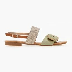 Πέδιλα σανδάλια με ψάθινη λεπτομέρεια. Έχουν suede φαρδιά φάσα με μεγάλη μεταλλική αγκράφα. Δένουν στο πλάι με λουράκι.